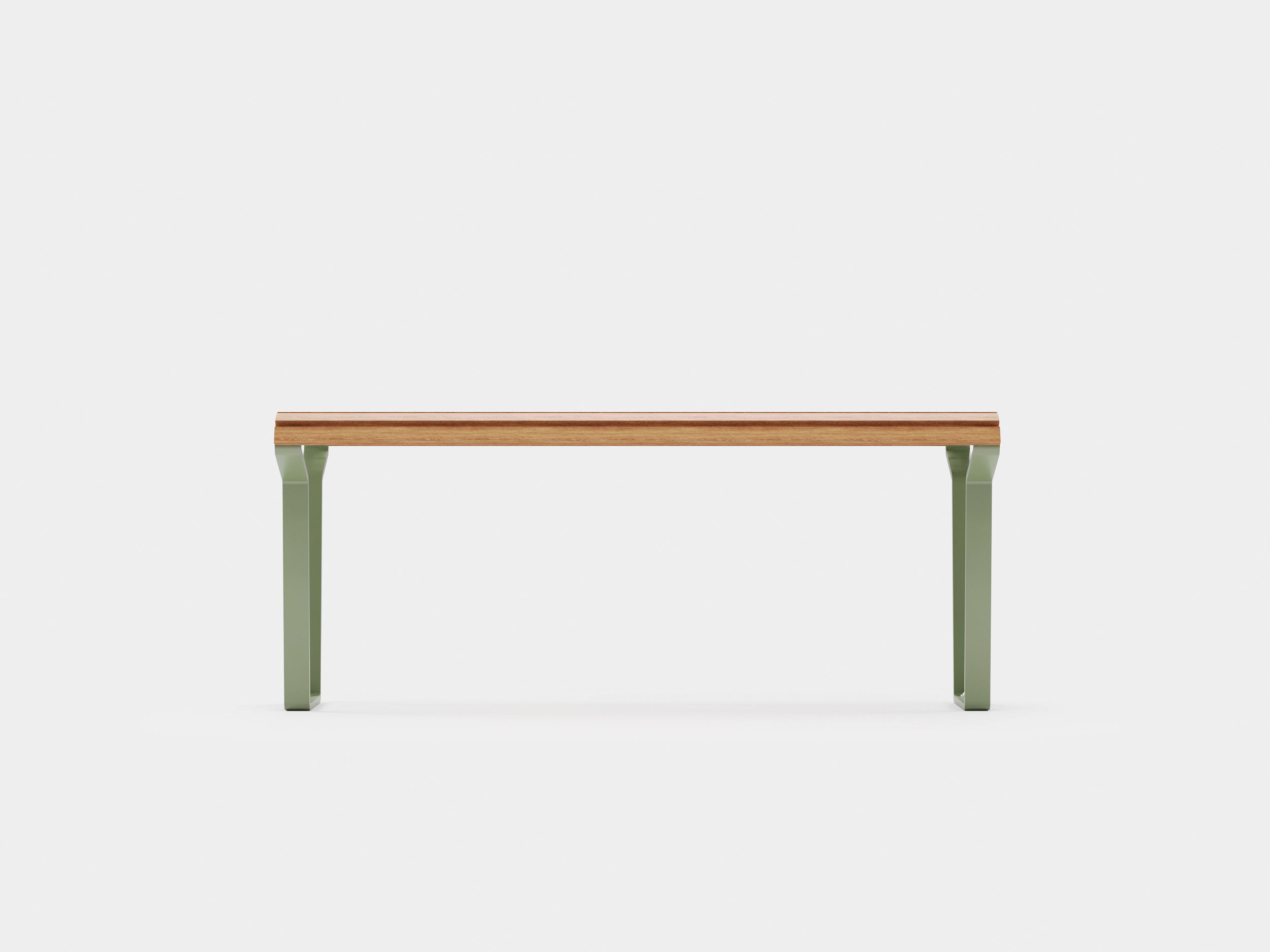 This table has a minimal, tapered frame, allowing for the Dek backless bench to easily fit inset under the edge of the table for a more ergonomic seating position. The top surface is constructed with a multitude of thin slats that curve around the edge of the table, providing extra comfort when resting arms on its surface.