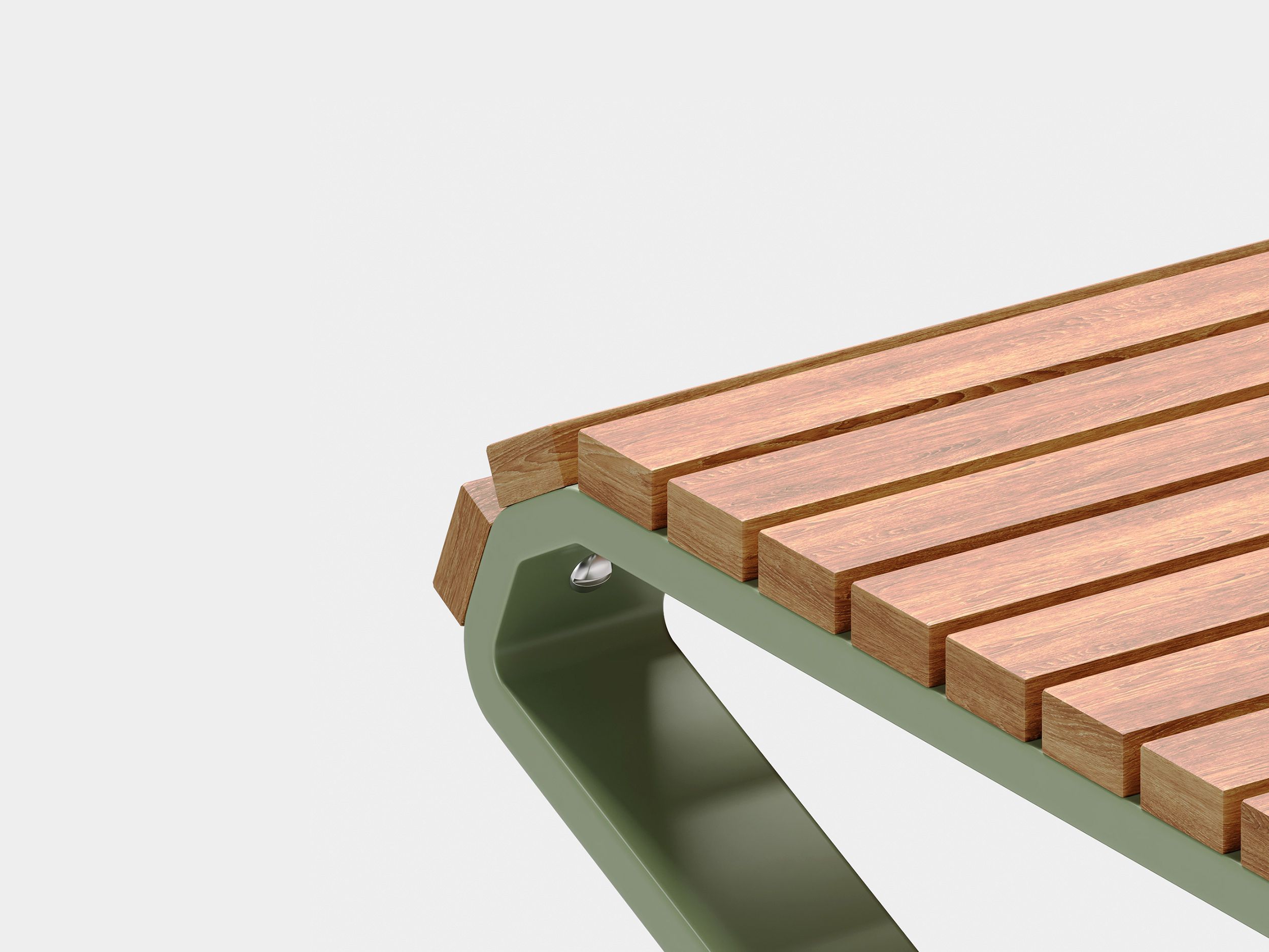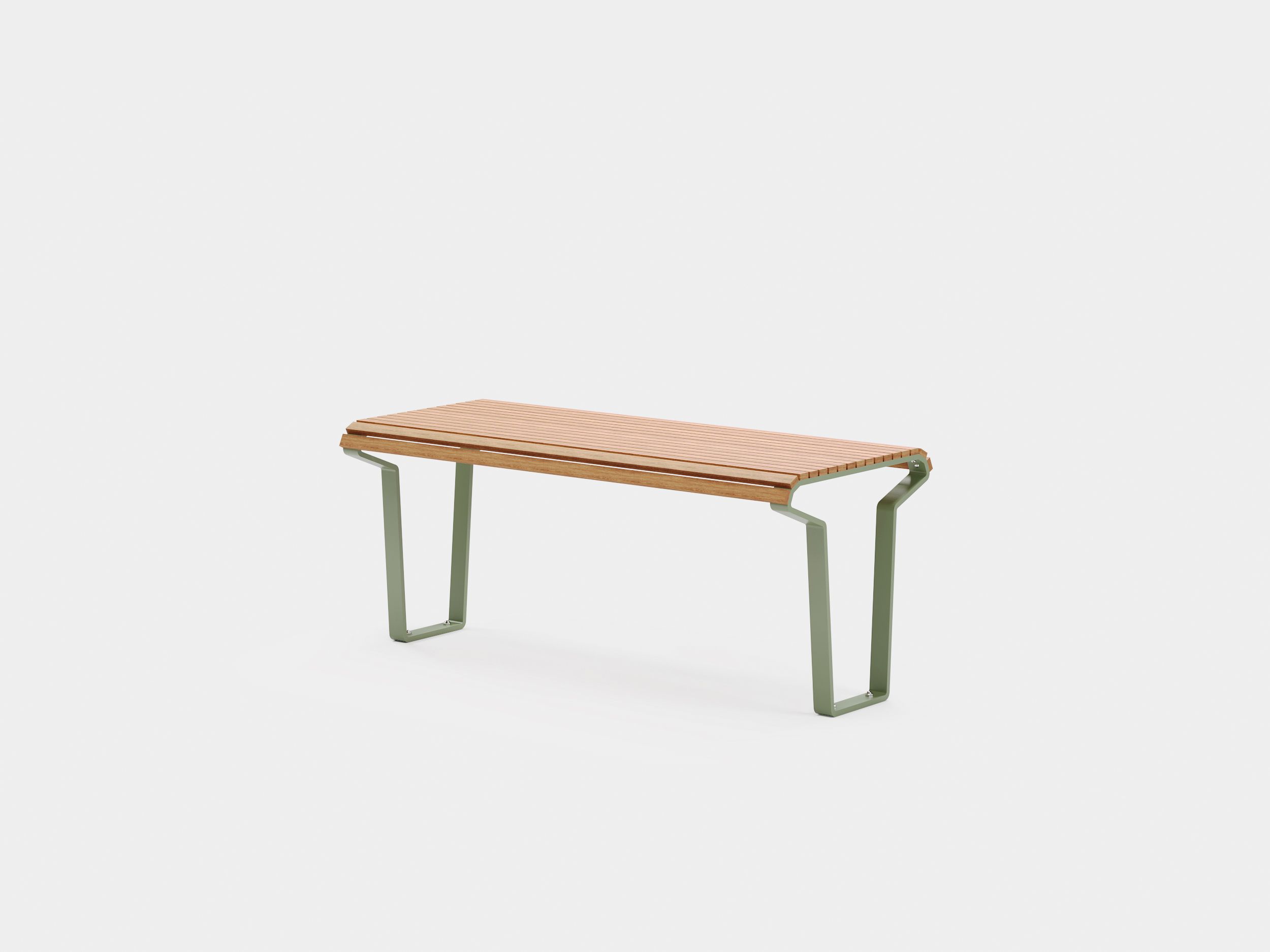 This table has a minimal, tapered frame, allowing for the Dek backless bench to easily fit inset under the edge of the table for a more ergonomic seating position. The top surface is constructed with a multitude of thin slats that curve around the edge of the table, providing extra comfort when resting arms on its surface.
