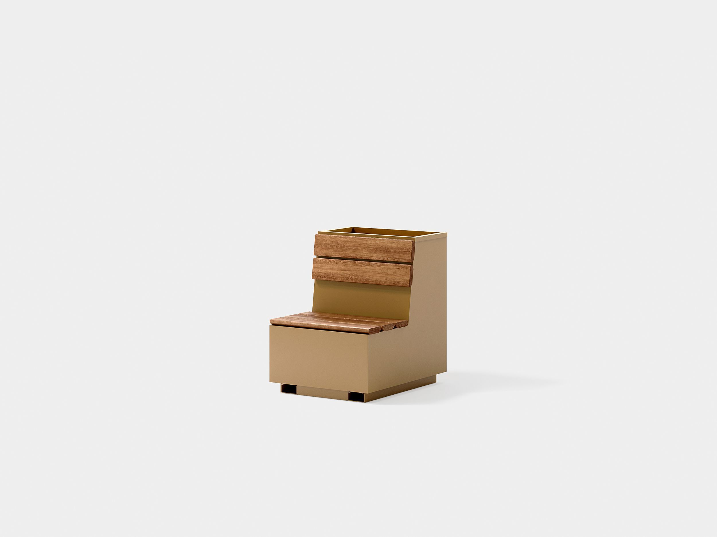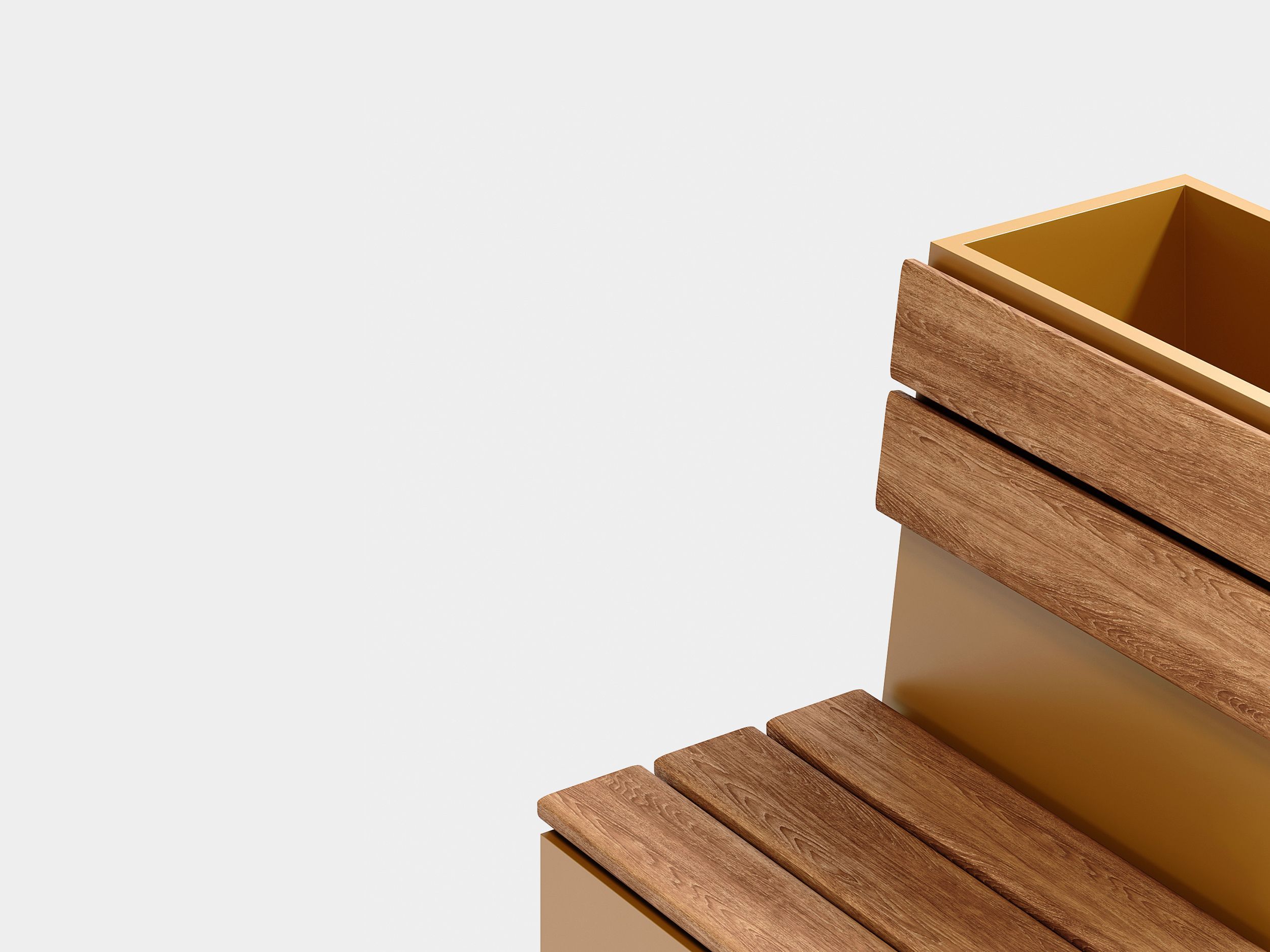 A planter and seat combined into one singular unit. Compact bench seating with integrated planter design. Powder-coated steel and wood accents add warmth and texture. Available in customizable finishes.