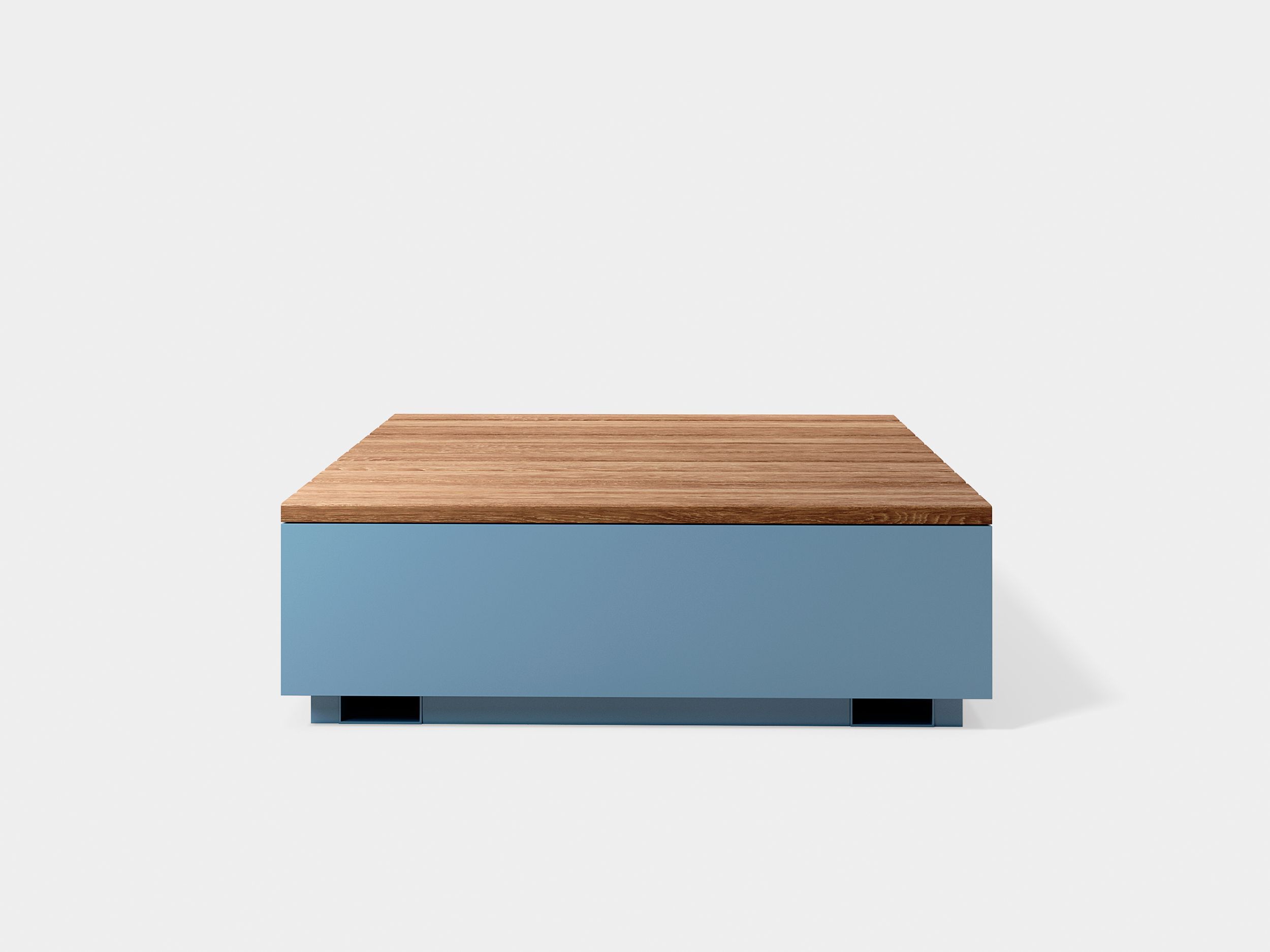 A large seating surface with integrated channels to allow for simple repositioning. A low-profile, modern bench with clean lines. Powder-coated steel and wood inlays create a simple yet inviting design. Finishes are fully customizable.
