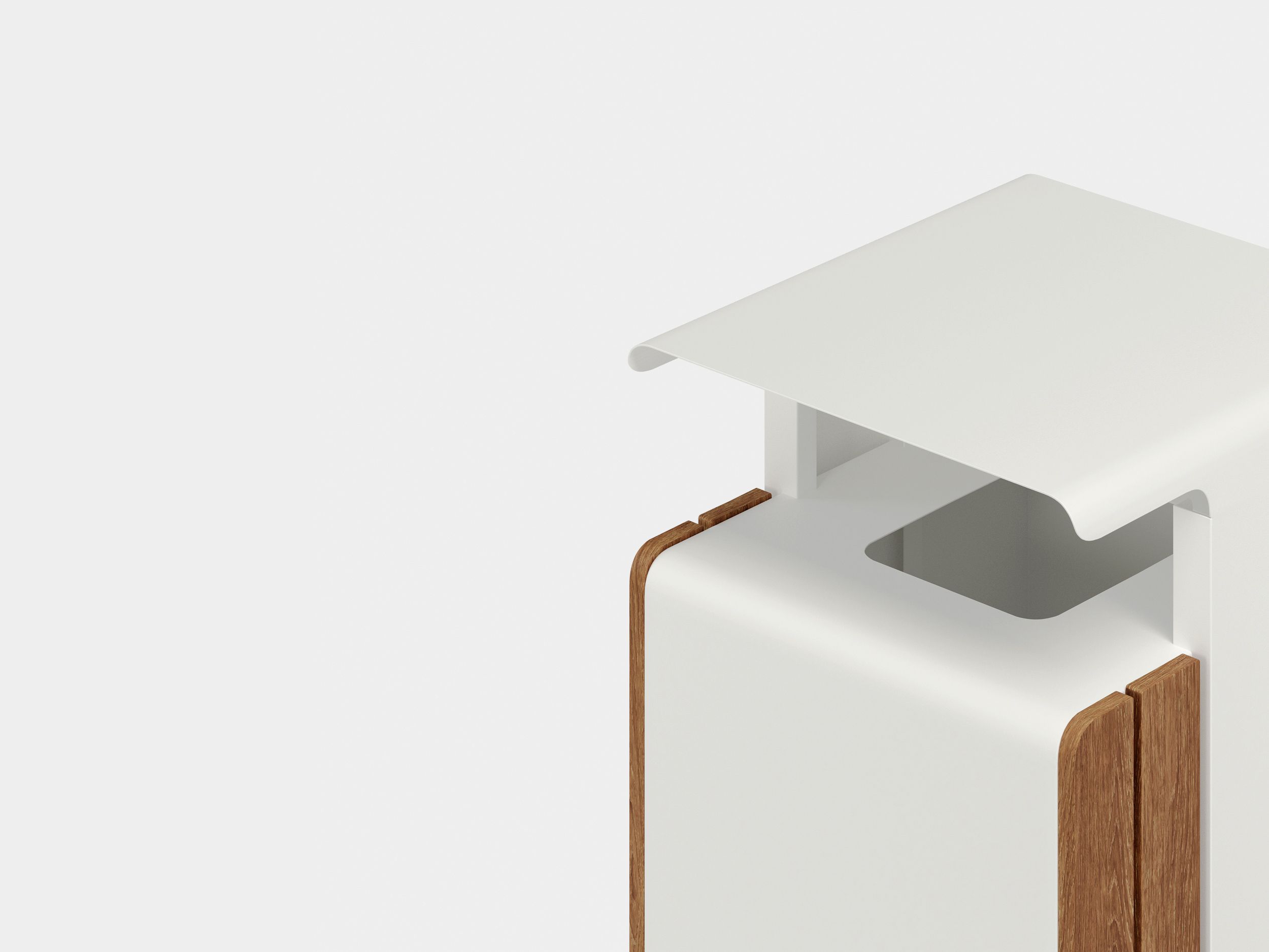 A bin that offers dual openings with wood and aluminum surfaces, and a minimalist appearance that exudes cleanliness and modernity.